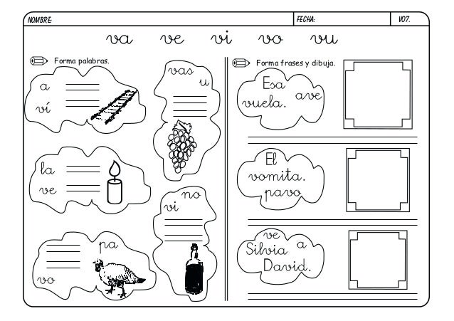 Silabas iniciales con la letra v25 fichas paginas de practica para la lectura y escritura de las silabas va ve vi vo vu y tarjetas con dibujos para el vocabulario con estas silabasthis is a set of 25 worksheets to practice the spanish syllables with v this product includes different pages with.