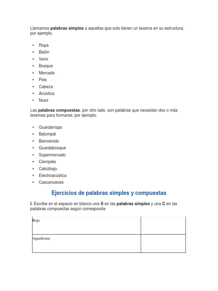 Ejercicios De Palabras Simples Y Compuestas