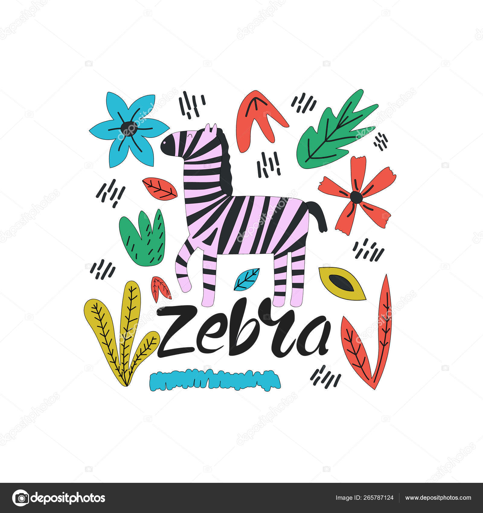 Cebra Colofrul Dibujada Mano Con Flores Zebra Palabra Con Diseno